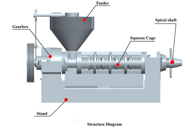 Screw oil press uses the electric motor or diesel as the engine. Before pressing, a small amount of oil plant seeds need to be pre-treated, such as peeled or cooked to get higher oil output. At the same time, turn on the heating switch to pre-heat the pressing cage. About